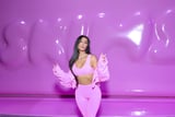 Take a look at Kardashian's new curtain bangs ahead, which she paired with hot-pink Barbiecore activewear for the Skims event.